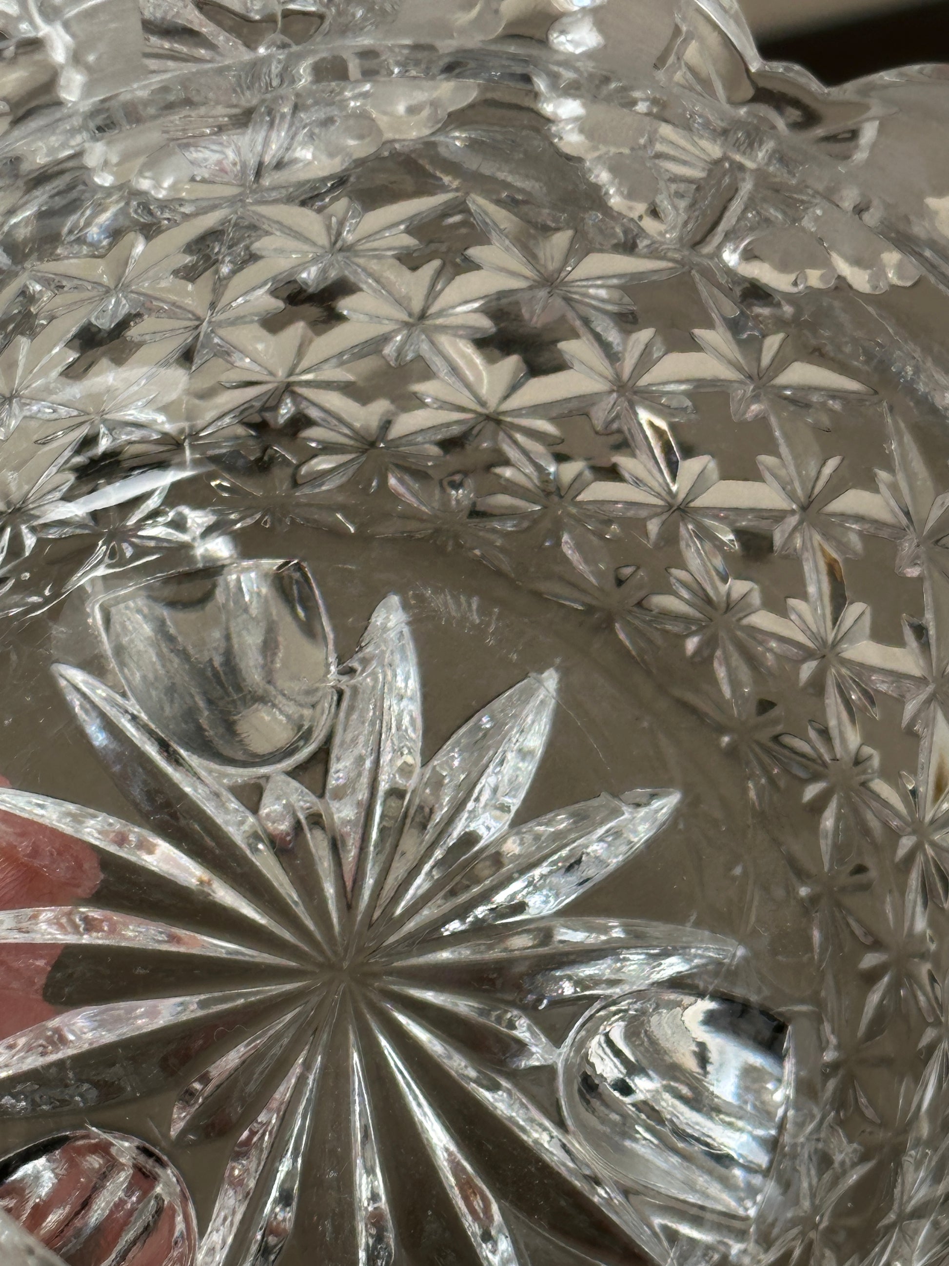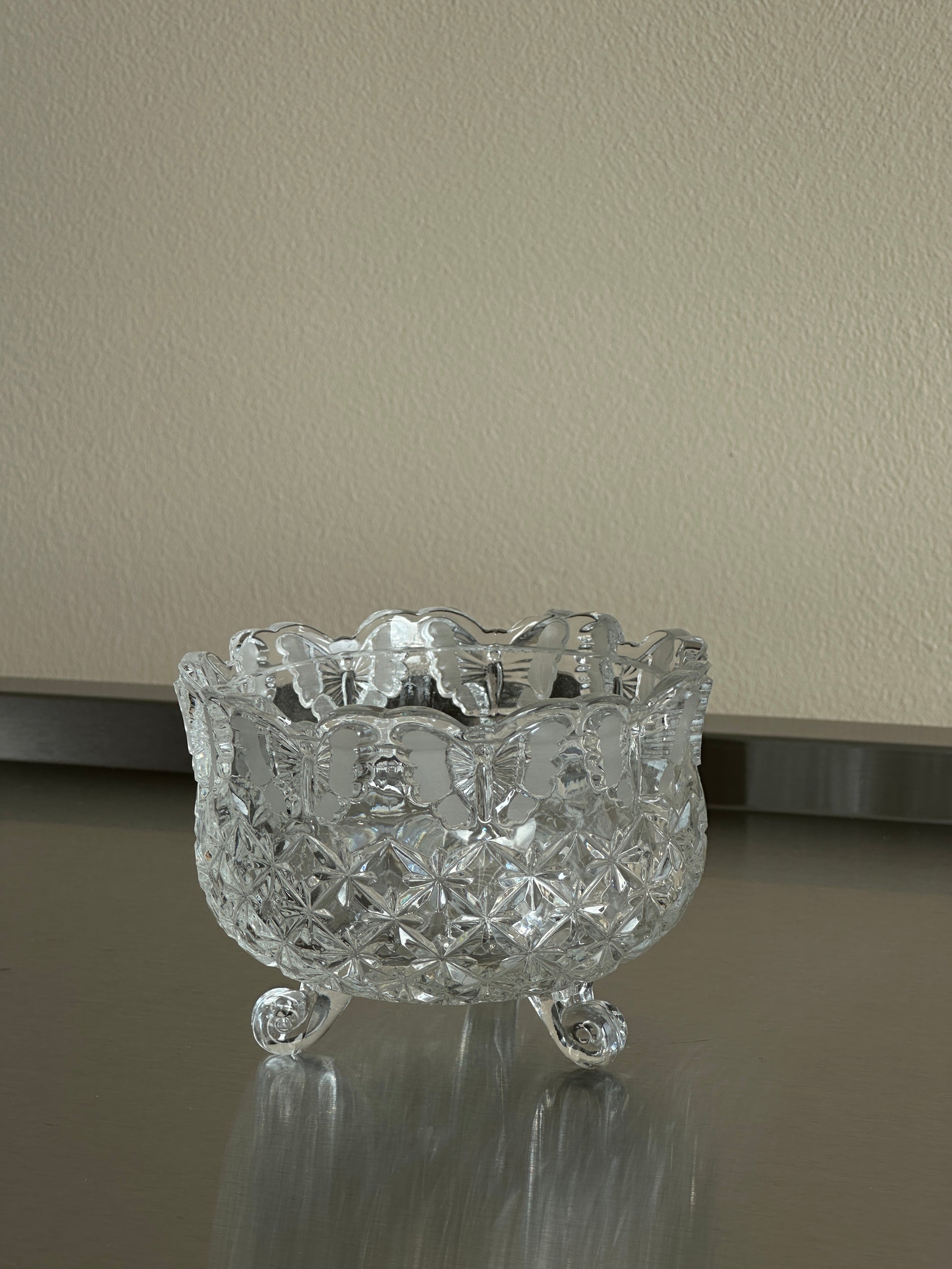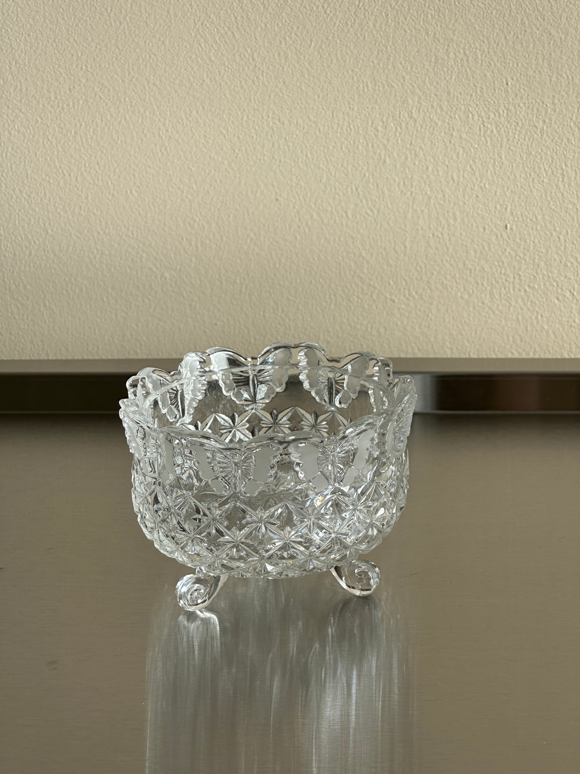 Vintage Hofbauer lead crystal bowl featuring the elegant butterfly design. Crafted in Germany, this footed bowl showcases frosted butterfly motifs and classic crystal cut details. Perfect as a decorative centerpiece, dish, or collectible vintage crystal.